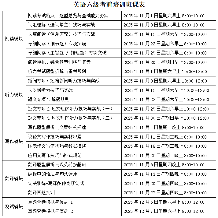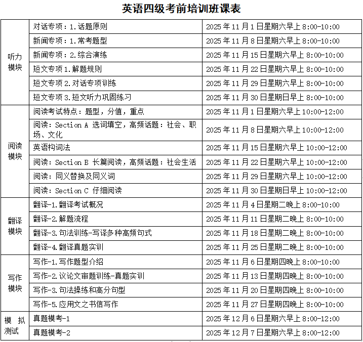 英语作为国际交流的重要工具,在教育和职业发展中扮演着越来越重要的角色。大学英语四、六级考试(CET-4/6)不仅是衡量大学生英语水平的重要标准,也是许多企事业单位招聘时参考的重要指标之一。 为帮助广大学生顺利通过大学英语四、六级考试,提升英语综合应用能力,星空网页版登录入口特别推出“大学英语四、六级考前培训班”。该项目旨在为应考学生提供系统化、个性化的学习方案,为顺利通过考试助力。 【培训目标】 帮助学员掌握大学英语四、六级考试的核心知识点和解题技巧。 提升学员在听力、阅读、写作及翻译等各方面的应试能力。 助力学员备考大学英语四、六级,取得理想成绩。 【培训内容】 听力专项:强化训练,习得技巧,提升分数 阅读专项:打破传统,掌握方法,争取高分 写作专项:活用模板,巧用句型,优化结构 翻译专项:逻辑转换,转变思维,着重产出 测试点评:全真试题,定位短板,科学提升 【培训对象】 1.星空网页版登录入口在读本科生和研究生; 2.南宁市内高校在读本专科生和研究生。 【培训方式】 线上线下混合教学:线上平台提供丰富的教学资源,方便学员随时复习和练习重点知识;线下课堂开展面授教学,包括知识点讲解、小组讨论、课堂练习等。 小班教学:每班学员控制在30人左右,确保教师能够关注到每位学员的学习情况,提供个性化指导。 【培训时间】 培训周期为5周,共48个课时,每次课50分钟。课程主要安排在周末及课余时间。计划2025年11月1日开课,12月7日结课。 【收费标准】 大学英语四级考前培训班:1580元/人/期。 大学英语六级考前培训班:1880元/人/期。 【联系方式】 咨询报名热线:0771-3235605 李老师 报名地址:星空网页版登录入口210办公室 咨询二维码 报名二维码
