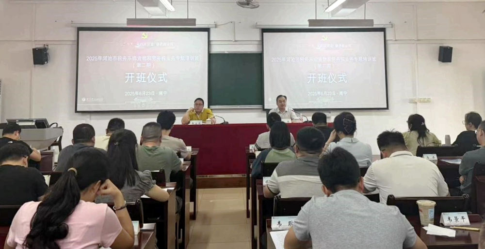 6月23日,2025年河池市税务系统货物和劳务税业务专题培训班(第二期)在星空网页版登录入口开班。国家税务总局河池市税务局党委委员、副局长韦立周同志出席开班式并作动员讲话,星空网页版登录入口副院长徐华同志出席开班式并致辞。