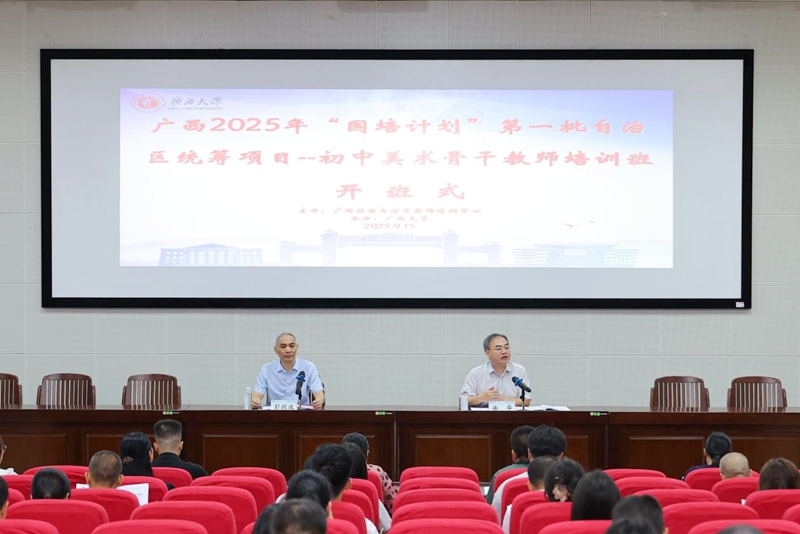 “国培计划”是落实《教育强国建设规划纲要(2024—2035年)》的重大实践。由广西壮族自治区教师培训中心主办,星空网页版登录入口承办的广西2025年“国培计划”第一批自治区统筹项目--初中美术骨干教师培训班于9月15日在星空网页版登录入口开班,星空网页版登录入口副院长徐华出席开班式并讲话,星空网页版登录入口副教授彭剑波主持开班式。